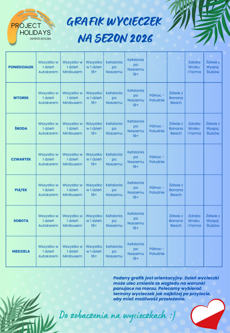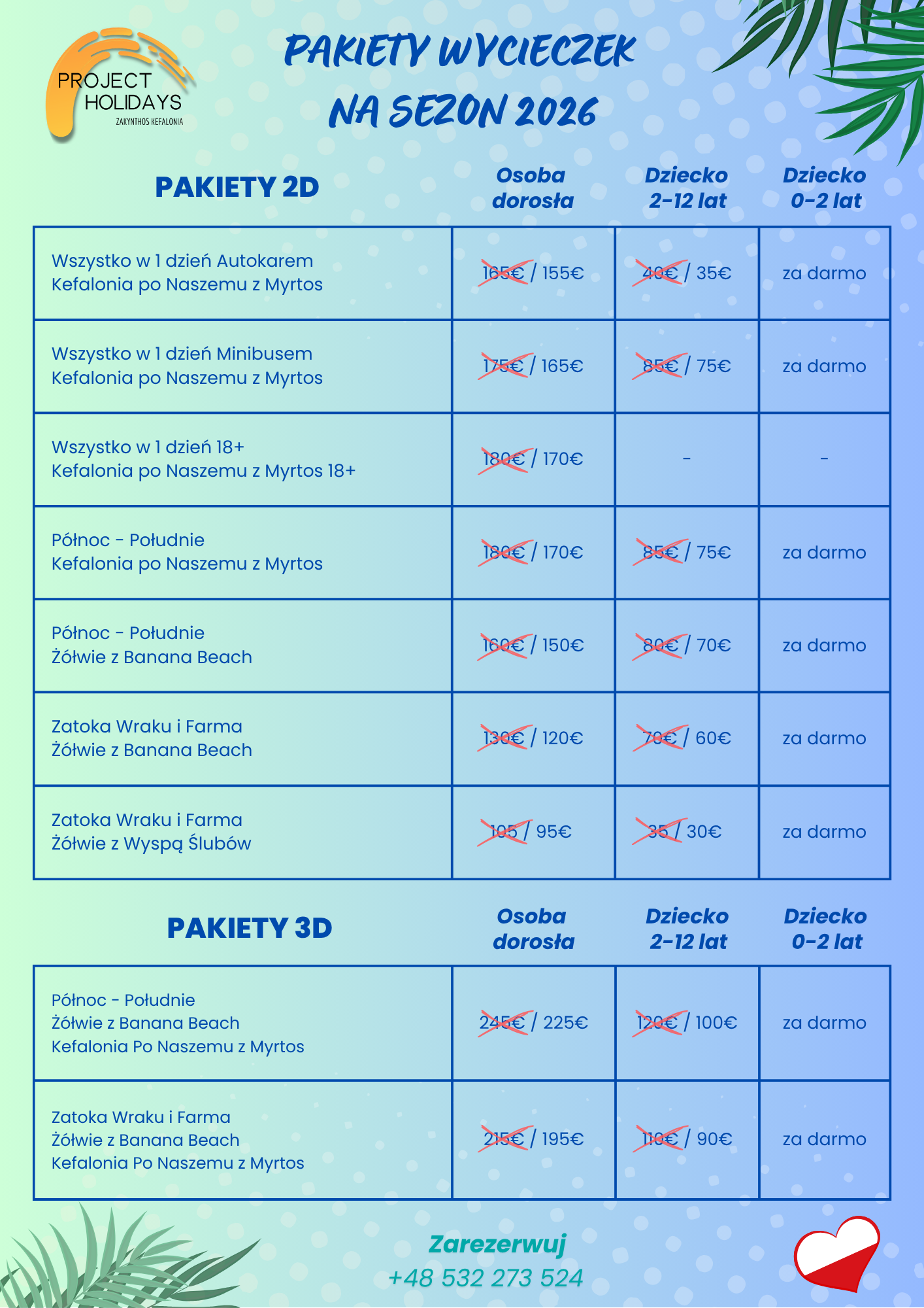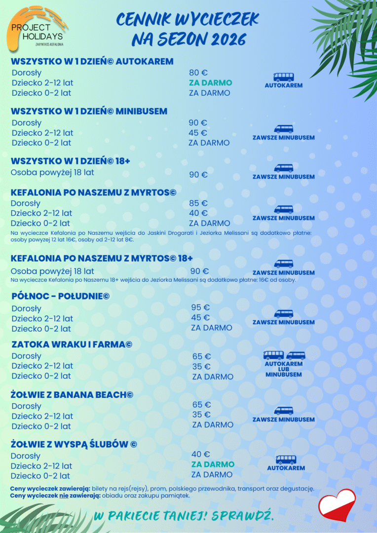 Kefalonia po Naszemu z Myrthos – dorosły 80€, dziecko 2-12 lat 35€, dziecko 0-2 lat brak opłat do zwrotu.